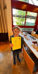 Unser jüngster Teilnehmer Lev Jitomirski traute sich mit gerade einmal 8 Jahren bei den großen U12ern mitzuspielen und erreichte mit 2 Siegen einen tollen Platz im Mittelfeld.