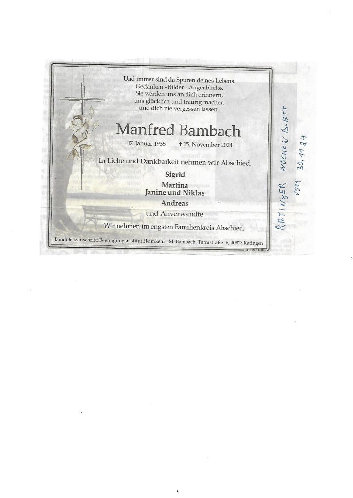 Wie wir erst heute erfahren haben, ist uns langjähriges Ehrenmitglied Manfred Bambach am 15.11.2024 verstorben.