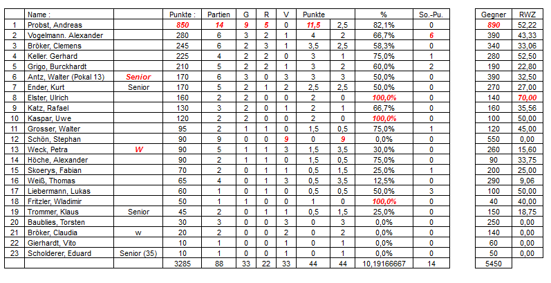 aufgrund des Sommerturnier lohnt es sich jetzt auch mal eine Ratzotabelle 2023 zu verschicken. Die Tabelle hat dieses Jahr ein ungewohntes Bild 😊. Freuen tue ich mich über die vielen Ratzen, die bereits eine Partie gespielt. In Bezug auf die Anzahl der Partien hätte ich gerne mehr Arbeit.